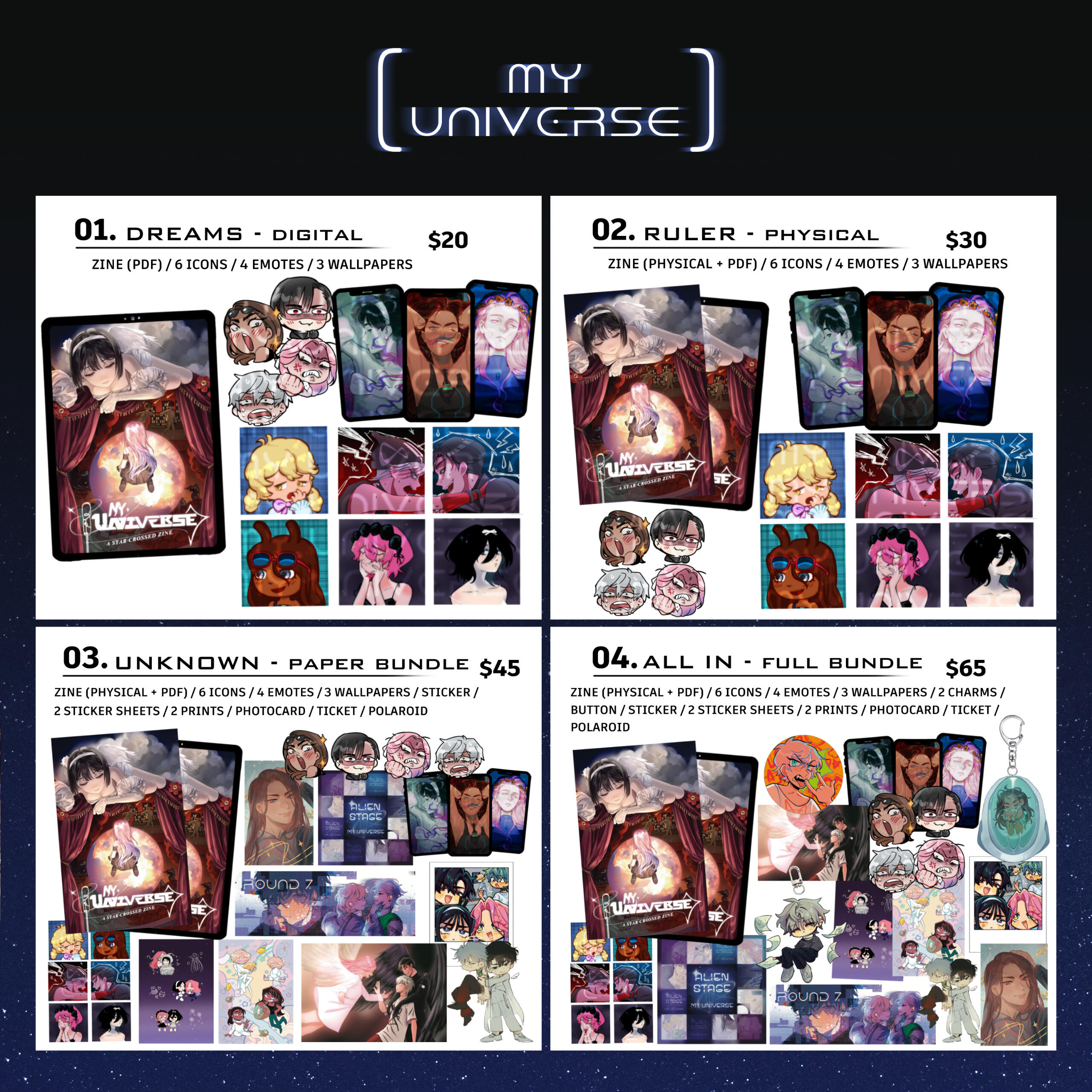 My Universe: A Star-Crossed Zine is an unofficial collaborative fanzine project dedicated to ALIEN STAGE, aiming to depict the duality between the idealistic personas on stage, versus the truth of the characters behind the curtain. The book aims to depict the various relationships between the characters, centered around the theme of a glass prism, where a single ray of light shoots into a rainbow of colours.The content of this zine is not primarily focused on the romance between characters, and more on their in-universe dynamics and tragedy of their narrative. The content will be divided by Rounds for ease of reading.The zine will be SFW, but includes the darker elements of ALIEN STAGE such as slight gore or blood.This is a for-charity zine. Amounts earned will first be used to cover production. Any leftover funds will be used to cover contributor copies and compensation of contributors & mods. The remainder will be donated to a pro-Palestinian charity (complete with receipts). We're currently looking for ways to donate to the ALNST production team.✦나의 우주: 별이 교차하는 팬진은 ALIEN STAGE(에일리언 스테이지)에 전념하는 비공식적인 협력의 팬진 프로젝트로, 무대 위의 이상주의적 인물들과 커튼 뒤에 숨겨진 인물들의 진실 사이의 이중성을 묘사하는 것을 목표로 합니다. 이 책은 한 줄의 빛이 색깔의 무지개를 향해 쏘아지는 유리 프리즘이라는 주제를 중심으로 인물들 사이의 다양한 관계를 묘사하는 것을 목표로 합니다.